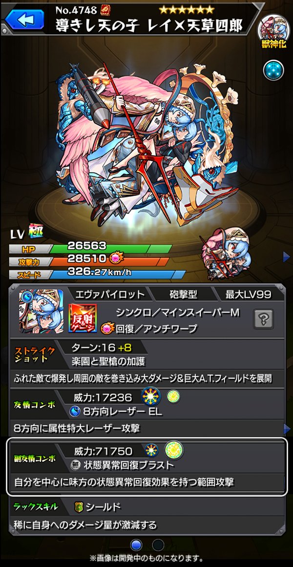 「導きし天の子 レイ天草四郎」!友情コンボの8方向レーザーELは砲撃型の威力で優秀!所持しているキャラが少ない貴重な状態異常回復ブラストも副友情コンボとして所持!ふれた敵で爆発し周囲の敵を巻き込み大ダメージ&巨大A.T.フィール… https://t.co/i4ikUbaWB1